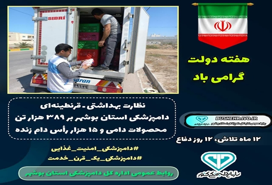 نظارت بهداشتی ـ قرنطینهای دامپزشکی استان بوشهر بر ۳۸۹ هزار تن محصولات دامی و ۱۵ هزار رأس دام زنده